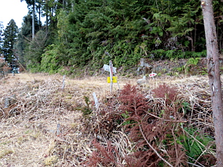 | 山行記 | ●一昨日、素晴らしい富士山を堪能したところだが、この日の同級生を中心とした山登りも富士山の展望を期待するものだった。ところがこの日の天気予報は曇りで、なかなか難しそうだが、とにかく富士山の姿は観たいものだ。 ●朝、豊川を出発して新東名高速道路を進んでいくと、雲が多い中、富士山の方向だけ雲が無く、霞んではいるものの富士山の姿を観ることができた。このまま山でも富士山を観ることができることを期待しながら登山口の駐車場を目指した。 ●駐車場は富厚里公民館の駐車場をお借りするのだが、一足先に着いた1車12人の団体が先に到着していて混み合っていた。こちらも支度を済ませて歩き始める。まずは公民館前の舗装道を上るのだが、いきなりかなり急な坂道だ。 ●車が通ることができる急な舗装道は折り返しながら上っていくが、周りは茶畑で、外の地域でもそうなのだが、上部は耕作放棄されていて伸び放題の茶の木が痛々しい。道沿いでは、茶畑で使われていただろうモノラックが朽ち始めていた。 ●舗装道からは富士山を観ることができたのだが、手前に厚い雲がかかり、残念ながら一部しか見ることができなかった。それでも、どのあたりが観えているのかはわからなかったが、雪で白くなった南アルプスも一部観ることができた。 ●そして舗装道終点に着くと、そこが登山口となるが、そこは既に標高400m近くになる。途中で中電変電所への道を分け、さらに急登を登っていくと林道に出るが、それを横断して登っていくと、再び林道と出合い、以降は傾斜も緩くなってくる。 ●しだいに展望が開けてきて静岡市街や藁科川、駿河湾などを見下ろすことができた。そして程無く広場に出るが、そこは既にダイラボウの足跡といわれる山頂直下になる。足下には静岡市街などの景色が広がっていた。 ●そこで、鈍よりと曇っていた空からついに小雨が落ち始めた。最初は雨はすぐ止むと思っていたが、雨脚が次第に強くなってきたので、各々雨用の装備を纏って山頂を目指す。 ●山頂へは広場の隅の階段を登れば呆気無く三角点のあるダイラボウ山頂に着く。山頂は、背後に樹林を背負ってているので、雨もそれ程苦にならない。しばらくそこで過ごしていたのだが、駐車場で出合った団体が上ってきたので下山することにした。 ●広場まで下ると、そこに居た常連の登山者に富厚里峠への下山路を確認して下山を始めた。道沿いではウメが咲き始め、地元のライオンズクラブが造成した「薬木の森」があり、いろいろな薬木が植えられていた。 ●やがて、茶畑が観えてくると、道は一旦舗装道と合流する。そのすぐ先で再び山道を下っていくと、また舗装道に出るが、そこが富厚里峠だ。峠には市道の開通記念碑が設置されていた。 ●後はこの舗装道をひたすら下って車を置いた富厚里公民館駐車場まで戻るのだが、麓では、耕作されている綺麗な茶畑が広がり、ロウバイの花がよく咲いていた。 |