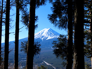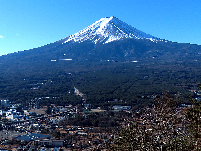 | 山行記 | ●今月の山仲間との山行の目玉も富士山。ということで、より富士山に近い河口湖畔の天上山へ行くことにした。この山は、河口湖畔から三ッ峠山へ行く際に通過する山で、今回はその先の霜山まで行って、下吉田駅へ下る周回コースをとることにした。 ●この日の天気予報は、少し緩んでくるようだが「今年最強最長の寒波」がまだ居座っていて、晴れるのだが、風が強く寒くなるということなので、防寒の装備をあれこれと詰め込んで豊川を出発した。 ●往きの新東名高速道路からは、文句のない富士山の姿を観ることができ、その後も雲一つ無い富士山を観ながら、車を置く予定の河口湖畔の舟津浜駐車場(無料)に着くことができた。 ●車を降りると、気温は低いものの風が無く覚悟した程の寒さは感じなかった。まずは富士山パノラマロープウェイ河口湖畔駅へ向かうが、平日関係無いインバウンドが多く歩いていて、ロープウェイに乗るが、乗客はほぼインバウンドで占められていた。 ●ロープウェイの富士見台駅は展望回廊や展望やぐらなどの富士山の展望を楽しむための観光施設が整備されており、うさぎ神社やたぬき茶屋など、この山の別名であるかちかち山に因んだ施設も整備されている。 ●ここまではロープウェイで手軽に登ることができるので、朝から多くのインバウンドが写真を撮影したり展望を楽しんでいた。そこを過ぎると一気に観光客は減り、やがて小御嶽神社が祀られる天上山山頂に到着する。 ●天上山山頂は事前に抱いていたイメージとは違い、樹木に囲まれていて展望は良くないが、樹々の間から富士山は確認することができた。山頂の解説版によるとこの山はかちかち山の外に嘯(うそぶき)山とも呼ばれているようだ。 ●天上山山頂からは緩やかに下り、その後徐々に上っていく。この辺りから道に雪が現れ始めるが、雪が凍っているわけではないので、特別雪の装備が要るわけでもない。 ●途中、舗装道に出るが、それを横切って再び山道を歩く。道の雪はさらに多くなっていくが、まだアイゼンやチェーンスパイクなどの滑り止めが無くても問題無く歩くことができる。 ●やがて傾斜が急になってくると、このコース最高点となる霜山山頂に到着するが、ここも樹林に囲まれて期待した展望は開けない。霜山で少し過ごした後緩やかに少し下ると、新倉山方面への下降点が現れるが、ここでようやく富士山の展望が開ける。 ●富士山の大展望が観られた富士見台から先では、樹々の間からしか観ることができなかった富士山だが、ここで一気に遮るものの無い富士山を観ることができ、テンションも上がる。 ●分岐からの富士山の展望を楽しんだ後、下吉田方面に下るのだが、いきなりロープの張られた急坂が始まる。雪が無いのが救いだが、ザレているのでロープを補助としながら慎重に下る。 ●急な下りが終わると、登山道にも雪が観られるようになり、大棚の滝への道を分けると、道は緩やかな上りとなる。見た目はかなり登るように見えるが、意外に呆気無く御殿山頂に着く。 ●御殿山頂からも富士山を観ることができる外、都留市街や周囲の山々を観ることができた。御殿山頂にはベンチがあるのでそこで少し休憩をした後緩やかに進んでいくと、およそ山頂とは思えない程地味な場所に新倉山山頂の表示が立っていた。 ●新倉山山頂から道は下り始め、「ゴンゴン石」、「亀石」、「慰霊塔」などを観ながらひたすら下ると東屋が現れる。そこも富士山の展望地になっており、この辺りからインバウンドを中心とした観光客が目立つようになってくる。 ●そのすぐ下が、観光案内の写真でも有名な、忠霊塔越しに富士山を撮影することができる所で、いい場所はインバウンドがごった返していて、順番待ちの状態だった。こちらもそれに交じって、この絶景を写真に収めてから下へ下へと下る。 ●インバウンドの大群に紛れ、浅間神社を経てさらに進んでいくと、下吉田駅に着く。富士急行の下吉田駅は、富士急ハイランドの中にあるトーマスランドのキャラクターで溢れていて、カラフルで楽しい。 ●下吉田駅からは、電車で河口湖駅まで行くのだが、駅のホームも電車の中もインバウンドがいっぱいだ。そして、途中の駅は全てトーマスランド一色で、駅毎に機関車トーマスのキャラクターが描かれた駅名表示があった。 ●そして河口湖駅に着くが、ホームや駅舎、駅前全て下吉田駅を凌ぐ多くのインバウンドが溢れ、カオスな状態になっていた。昼の時間も過ぎたので、駅前の喫茶店で吉田うどんを頂いたが、2階の富士山がよく見える席で食べることができた。 ●食事を終えると、後は車を置いた河口湖畔の舟津浜駐車場へ戻るだけだったのだが、せっかくなので、有名になった「富士山ローソン」の様子を観ていくことにした。現在は目隠しが取り払われた状態で、やはり報道にある通りの混雑状況だった。 ●舟津浜駐車場に着くと、途中富士山の観え