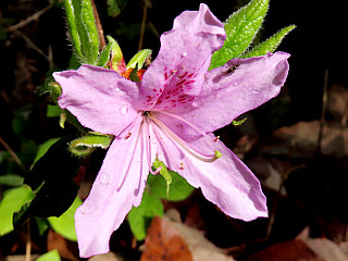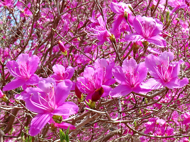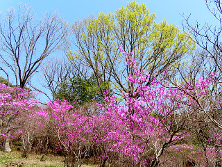 | 山行記 | ●4月になると気になる、萩の善住禅寺のミツバツツジの開花だが、数日前地方紙で「見頃」と紹介されたので、実際は少し早いのではないかと思いながらも、平日を選んで出掛けてみることにした。 ●早朝に自宅を出て、途中で朝食を摂りながら現地へ向かうが、9時から始まるという駐車場には1時間程早く着いてしまい、駐車料金はまだ受け取ってくれなかったので、下山してから支払うことにして出発した。 ●肝心のコバノミツバツツジは思っていたとおり少し早いようで、今年も報道に騙されてしまったようだ。ただ、係の人によると、自生のミツバツツジが密生していて勢力が弱まっているということで、大学教授の指導の下回復を目指しているということだ。 ●とりあえず善住禅寺を参拝してからツツジ展望台に上ってみると、やはり斜面を覆う程咲いているとは言い難い状態だ。ツツジ展望台から下りると、まずは寺の横を通り、裏手にある遊歩道を歩いて背戸山を目指す。 ●獣除けの柵の出入口を開け閉めして尾根道に付けられた道を登っていく。薄暗い樹林の中、所々にコバノミツバツツジの木があり、そこだけスポットライトが当たっているかのように明るく見える。 ●道はしだいに急になり、それを登り切った所に道標が現れるが、そこが自然探勝路との分岐になる。そのすぐ先にはテーブルとベンチのある休憩所がある。この辺りはコバノミツバツツジの木が多い所で、樹々の間からは観音山も観ることができる。 ●休憩所から少し下りさらに進むと標柱のある背戸山の鞍部で、そこから急な上りが始まる。前日降った雨で地面が微妙に濡れており、加えて落葉もあるのでとにかく滑りやすい急坂で、これは下る時の方がさらに大変になることだろう。 ●途中で少し傾斜が緩やかに代わると、程無く背戸山山頂に到着する。背戸山山頂は小広い広場になっていて、ベンチと、片隅にはお地蔵様が祀られている。また、空は抜けているが樹木に取り囲まれていて展望は無い。 ●少し前までは、背戸山山頂から先は急に道が不明瞭になっていたが、このところ、反対側の鳥川アルプスの一峰として訪れる登山者が増えてきたようで、大分歩かれ道もわかりやすい。 ●意外にアップダウンのある尾根道は、大き目のコブを超えると送電線鉄塔のある鞍部に着くそこからもう一つのコブを超えるとコシダが生える斜面が立ち塞がる。コシダの中にも踏み跡はあるが、ここは右へトラバースする道があるのでそちらへ進む。 ●道は途中不安定な箇所もあるが、そのまま進むと鳥川アルプスの稜線に出る。そこから右に「巡礼の道」とある稜線を辿ると梅山山頂に着く。梅山山頂にはベンチや、すぐ先の艶山の名の由来が書かれた看板がある。 ●梅山から右に折れて少し下り、登り返すと艶山山頂だ。艶山も梅山と同様展望が無いので、ここまでで来た道を引き返す。背戸山山頂まで戻ると、下りの方がさらに大変な急坂を下り、分岐からツツジ群生地の方へ下っていく。 ●コバノミツバツツジはよく咲いていたが、埋め尽くすという程では無く少々期待外れではあったが、青空とコバノミツバツツジと新緑の樹々がいい感じで、平日ではあるが多くの見物客がそれらを楽しんでいた。 ●舗装道まで下ると、富士神社の方へ進み、ツツジのトンネルを下ってみるが、ここも「ツツジのトンネル」という名が付く程よく咲いてはいなかった。 ●ツツジのトンネルを下ると、参道から富士神社へ登り返し、参拝をしてから駐車場へ戻った。駐車場では往きに受け取ってくれなかった駐車料金を支払い、善住禅寺を後にした。帰りは、すぐ近くの「寺そば」へ寄り、ボリュームたっぷりのそばを頂いた。 |