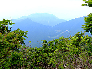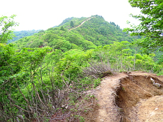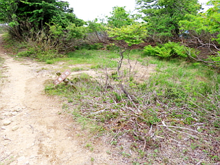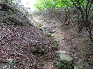 | 石と倒れ込む樹々で歩き難い登山道 | 貝月山山頂 | 貝月山山頂からの展望 |