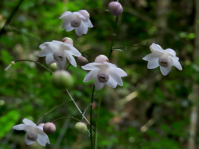 | 山行記 | ●この日は同級生を中心とした山登りなのだが、今回は、レンゲショウマが咲き始めたということで、一度行ってみたかったエビネの森へ行こうと考えた。それでもそれだけでは山登りにならないので、香嵐渓周辺の山とセットで訪れることにした。 ●香嵐渓周辺の山は、初めは黍生を考えていたが、飯盛山でキツネノカミソリが咲いているということなので、ボリューム的にはやや物足りないがそちらへ行くことにした。 ●エビネの森は、レンゲショウマが咲いているということで、エビネの時期程ではないが、混雑が予想されるので、朝早めの7時に豊川を出て最初に訪れることにした。 ●現地は駐車場が狭いということなので、心配しながら向かったのだが、なんとか一台分の空きがあったので無事車を停めることができて一安心だ。敷地内には「ようこそ」などと書かれた看板があったりで歓迎されている感が満載だ。 ●それでも初めて訪れるので、家主の人に挨拶をしようとしたが、留守なのか応答がないので、建屋の中を通って「順路」の案内に従って裏山を登り始めることにした。 ●この時期さすがにエビネは咲いていないが、葉は各所にあり、時期になればさぞかし素晴らしいことだろう。エビネだけではなくムサシアブミの葉もよく観られた。 ●意外と急な裏山を登っていくと柵の出入り口があり、それを開け閉めして入ったところがレンゲショウマが咲いているところだ。レンゲショウマはまだ咲き始めのようで、まんまるい蕾が目立つが、独特で可憐な花も十分観ることができた。 ●先に訪れていた方たちに交じって、こちらも存分に花を楽しんだ。そこには外にもキレンゲショウマやヤブタバコ、ヤブミョウガなどが咲いていた。 ●エビネの森でレンゲショウマを堪能した後、香嵐渓の飯盛山の近くの西町駐車場横の民間駐車場に車を停めた。駐車場の係の人に聞く以前に、山肌をオレンジ色に染めるキツネノカミソリの群落が目に飛び込んできた。 ●支度を済ますと早速飯盛山へ向かう。キツネノカミソリは通常の登山道とは違う道沿いに多いので、まずはそちらへ向かうが、ここ数日で一斉に咲いたというキツネノカミソリの花は圧巻だ。 ●歩いてきた道も飯盛山山頂へ向けて続いているので、そのまま登っていくと、途中で通常の道と合流したのでそのまま登っていくが、ステップの大きい階段がなかなかきつい。 ●それでもなんとか登っていくと飯盛山の山頂に到達することができた。山頂には磐座があり、その傍らに東屋があるので、そこで休憩だ。この暑い時期なので、ここまで登ってくる観光客も少なく、貸し切り状態で過ごすことができた。 ●飯盛山山頂は樹林に覆われすっきりとした展望は無いが、木々の間から隣の足助城や麓を観ることができた。さすがに山頂は木陰で涼しい風が吹いていて心地いいのでしばらく過ごした後下山を始めることにした。 ●下山は登ってきた道の途中から分岐する、香積寺方面の道を下る。この道は往きに来た道より階段も少なく歩きやすい。やがて立派な香積寺に着くので、御朱印を集めているメンバーはそこで御朱印を受領していた。 ●香積寺まで来ると観光客も多くなり、そこから石段を下りメイン道路に下るとさらに多くなる。香積寺から下ったところが足助屋敷と呼ばれるお土産屋やカフェなどが集中する場所なので、そこで昼食を頂いた後、観光客に交じってメイン道路を歩いて駐車場まで戻った。 |