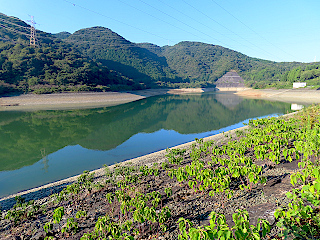 | 五葉城址 | 林道途中の伐採地から観る五葉湖と吉祥山 | いつも水を被っていた林道も水が無い |