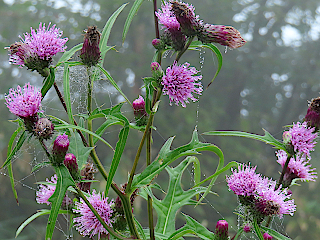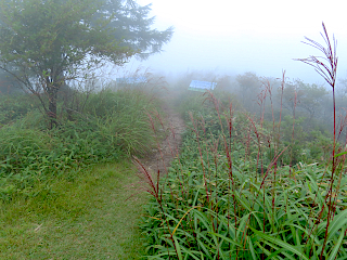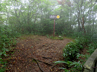 | 山行記 | ●この日は同級生を中心とした山登りの日で、9月になっても猛暑日を記録するなどまだまだ暑いので、標高の高いこの山へ行くことにした。ここならば、そろそろ咲き始めたであろう秋の花と、アルプスなどの展望が期待できる。 ●ところが、このところ日本列島には秋雨前線が停滞し、全国的に不安定な天気が続いている。この山の登山口の天気も、確認する度に予報が変わり、雨マークが出たり、曇りマークになったりで忙しい。 ●登山口へ向かう途中もどんよりとした雲に覆われ、いつ雨が降り出しても不思議ではない感じだった。そして登山口に着いたときに、ついに雨具がいらないぐらいの弱い雨が降り出した。 ●それでもこれ以上ひどくはならないだろうと、雨具を着けずに歩き始めた。最初に歩く別荘地内の急な舗装道沿いでは、ママコナやアキノキリンソウ、ツリフネソウなどの花が咲いていたが、暗いので写真が手ぶれしてしまわないかと心配だった。 ●途中、登山口の案内があるので、それに従って別荘地の中の山道を登ると舗装道に出るが、その道を挟んだ反対側が蛇峠山の登山口になる。以降は山道が続くので、別荘地内では遠慮気味だった熊除けの鈴を鳴らし、意識して会話をしながら登っていく。 ●登山道は意外と草が刈られていて、心配していたズボンの裾の濡れも気にならない。カワチブシやアケボノソウなどが咲く平坦地を過ぎると道は急になり、やがて尾根筋に出て、その後すぐに舗装道に出る。 ●舗装道を少し歩くと再び山道の入り口が現れるので、そこから急な山道を登り切ると馬の背に着く。左へ行くと展望台があり、そこから南アルプスなどを展望できるはずなのだが、この日はガスに包まれそれは望むべくもないのでそのまま右へ下る。 ●馬の背を下ると車止めのある広場に出るが、そこが蛇峠山の登り口と駐車場になっている。この日はこんな天気なので車は1台も停まっていなかったが、舗装道を車で来てここから蛇峠山へ登る人もいるようだ。 ●登山口からは急な道が続くが、ひたすら登っていくと最初の舗装道に出る。以降も2度舗装道に出るが、3度目の舗装道に出ると、そこからはそのまま舗装道を登るようになる。 ●以降は、遠くからでもそれとわかる蛇峠山の電波塔群の中に続く舗装道を登っていくが、マツムシソウやツリガネニンジン、ウメバチソウ、ゴマナなどの秋の花が咲いていていい感じだ。 ●やがて蛇峠レーダ雨量観測所に着くが、ガスがますます濃くなったきて霞んで見える。その先には狼煙台跡があり、そこからも南アルプスや中央アルプスなどが見えるはずなのだが、このガスではそれも絶望的なので、まずは蛇峠山山頂を目指す。 ●蛇峠レーダ雨量観測所から一旦下り、登り返したところに鉄製の展望台があるが、そのすぐ横に山頂表示と三角点が設置された蛇峠山山頂だ。三角点の上には今年の干支の蛇の置物が置かれていた。 ●鉄製の展望台は腐食が激しく危険なため、それに上る階段に使用禁止のテープが張られていたが、それも切れてしまって、最近ではそれを知らない人が登ることもあるようだが、木々が伸びていて展望は思う程良くない。 ●こちらは展望台には上らず、下で一時休憩をした後、下山を始めることにした。途中、一応狼煙台後へも行ってみたが、やはりガスは消えていなかった。そして、帰りは全て舗装道を歩いて下ることにした。 ●下山後は、治部坂高原の蕎麦処おにひらで、残念ながらあと数日で新そばに代わるというそばを頂き、道の駅の温泉で汗を流してた後帰路に就いた。この日も下界は猛暑になったようだが、そんな中、少しも暑さを感じずに過ごせたことは有難かった。 |