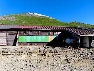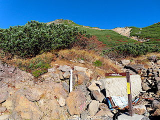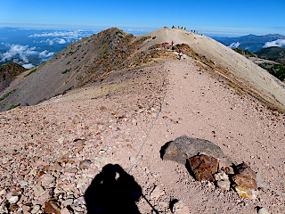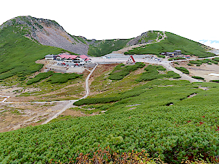 | 行程 | 乗鞍高原観光センター駐車場(7:00)━<シャトルバス>━肩ノ小屋口(7:44-50)・・・肩ノ小屋(8:25-34)・・・乗鞍岳(剣ヶ峰)(9:37-55)・・・頂上小屋(10:15-48)・・・蚕玉岳(10:54)・・・肩ノ小屋(11:35-58)・・・畳平(12:37-13:05)━<シャトルバス>━乗鞍高原観光センター駐車場(12:00) | |