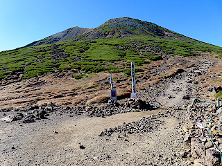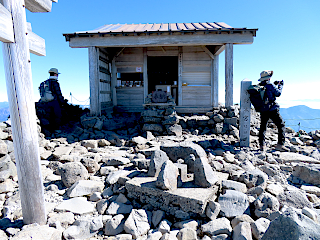 | 今シーズンの営業を終えた肩ノ小屋 | 肩ノ小屋から剣ヶ峰を目指す | 蚕玉岳を過ぎると剣ヶ峰への道が見える |