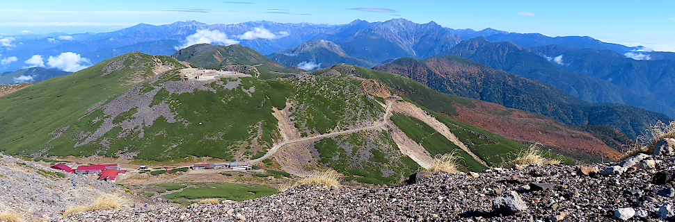 | 山行記 | ●先月左足の足底を傷めて、まだそれが完全に治っていない状態なので、ここへ来る前に地元の山でお試しをしたかったのだが、なかなかその時間がとれず、結局ぶっつけ本番でこの3000m峰を登ることになってしまった。 ●乗鞍岳は、時間的には短く手軽に登ることができる山なのだが、3000m峰ならではの険しさがあり、加えて空気も薄いので決して侮ってはいけない山だ。 ●前日、上高地を歩いたので少しは足慣らしになったかと思ったが、やはり完全には痛みがとれていないので、不安を抱えながらの本番となった。 ●朝、乗鞍高原の宿舎を出て車で乗鞍高原観光センターまで行き、予め予約をしておいたシャトルバスに乗った。バスは、いい感じの木々の紅葉の中を走り、森林限界を超えると、青空を背景とした山頂部が見えてくる。 ●登山口の肩ノ小屋口バス停で下車すると、早速岩の多い急な道を登っていく。足の感じは微妙で、足の置き方によっては痛みが走るので慎重に足の置き場を選んでゆっくり登っていく。 ●左手は遅くまで雪渓が残るところだが、この時期雪は全く無い。ハイマツの周辺ではライチョウを観ることが多いのだが、登るのに必死でそちらに目をやる余裕が無い。 ●やがて肩ノ小屋に着くが、9月で営業を終了したということだ。近くに新しい小屋を建設中のようで、工事用の車両が停まっていて変な感じだ。 ●肩ノ小屋で休憩した後、いよいよ山頂の剣ヶ峰を目指す。道は肩ノ小屋までの道と比べると歩きやすいが、標高が上がるに連れ空気が薄くなっていくのを実感する。 ●道はしだいに急になるが、振り返ると穂高岳や槍ヶ岳を始めとする北アルプスの峰々、八ヶ岳や南アルプス、中央アルプスなどをぐるりと見渡すことができる。朝日岳の山頂部を巻くと、鞍部から権現池が見え、その先の白山連峰も観ることができた。 ●ここまでも風が強かったのだが鞍部は風の通り道のようでさらに強く、まっすぐ足が運べない程だった。蚕玉岳の山頂部を巻くと、いよいよ剣ヶ峰への最後の登りとなる。そして岩の多い急坂を登り切ると乗鞍岳山頂の剣ヶ峰に到着だ。 ●剣ヶ峰には一等三角点があり、神官が常駐する乗鞍本宮の社が鎮座している。社の周りを一周すれば360度の展望を楽しむことができる。 ●社の裏手には長野県側の祠があり、そこから少し下ったところには山頂小屋が建っている。小屋前は今流行りのウッドデッキがあり、そこは外の場所とは違って強風が当たらないので気持ちがよく、ついつい長居をしてしまった。 ●山頂小屋からは来た道と合流し、往きに寄らなかった蚕玉岳に寄ってから来た道を戻り、肩ノ小屋へ戻る。肩ノ小屋からは車が通ることのできる広い道を歩いて畳平へ下った。 |