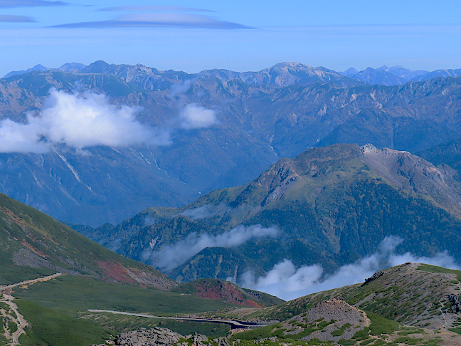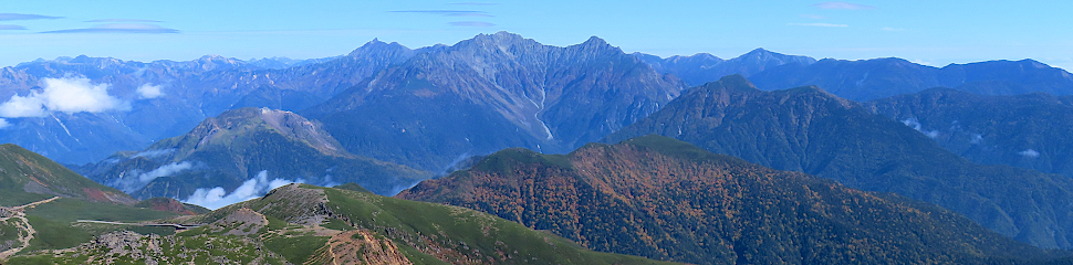 | 朝日岳付近から振り返る乗鞍岳の峰々と北アルプス | ||