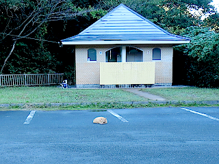 | 五葉湖駐車場に座り込むネコ | 雨不足で水位の下がった五葉湖と五葉山 | 野鳥の森入口 |