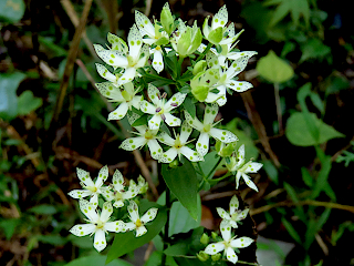 | 山行記 | ●アケボノソウの様子が観たくて五葉湖周辺の山々を歩くことにした。いつものように五葉湖駐車場へ車を停めたが、駐車場の駐車区画内に先月と同じく一匹のネコが居座っていて、人が来ても逃げる様子も無い。 ●これは先月見たのと同じネコのようで、先月は下山する頃にはいなくなっていた。ネコは、怪我や病気があって動けないようではなさそうで、外にねぐらがあって毎朝ここに来るのだろうか。 ●それはともかく、まずは五葉湖堰堤を歩いて野鳥の森を目指すが、このところまとまった雨が降らないせいか、五葉湖はますます湖面の水位が下がってきていて、心配になる。 ●道沿いではハナゾノツクバネウツギが終わりかけ、セイタカアワダチソウやセンダングサなどが目立っていた。野鳥の森入り口に着くと、山道に入り、レンゲツツジの小径を経て作業道に出る。 ●その後はこの作業道を歩くのだが、作業道で沿いではレモンエゴマやシモバシラ、キツネノマゴなどが咲き、フユノハナワラビなども色づきかけていた。 ●作業道終点の送電線鉄塔のある広場から山道が始まるが、ツクシハギが咲き残る外はこれといった花は見られなかった。赤い実の小径を分けるといよいよ五葉山への、雨に濡れて滑りやすくなった急坂が始まる。 ●そして、それを登りきると三角点のある五葉山山頂だ。送電線鉄塔周りの木々が刈られたところからは三河の山々が見渡せるが、来る度に少しずつ進んでいく豊橋スマートインター建設工事の進捗状況がわかるので面白い。 ●五葉山からは市境の尾根を辿り、五葉城址分岐、高城砦跡を過ぎて徐々に登っていくと豊橋や豊川市街、田原アルプス、三河湾などが見渡せる展望地に出る。そこまで来れば後少しで平尾山山頂に着く。 ●樹木に囲まれていて展望の無い平尾山山頂だが、ここは県境となる弓張山地主稜線が貫いており、以降はそれをしばらく歩くことになる。 ●平尾山山頂から急坂を下り、小さな岩場を過ぎると伐採地に出る。そこで展望が一気に開け、浜名湖や富士山、南アルプスなどを観ることができるのだが、この日はその方面の雲が多く富士山は見ることができなかった。 ●伐採地の、展望はいいが不安定な急坂を下ると送電線鉄塔に出る。そこからは主稜線を外れて送電線鉄塔巡視路を下る。短いが急な坂は滑りやすく、最後の作業道との出合は特に不安定で、この日のように濡れて滑りやすい状態ではなおさら危険だ。 ●作業道に降り立つと後しばらくはその作業道を歩く。作業道には花が多いだが、この時期はマツカゼソウやキツネノマゴなどが観られる外はこれといった花は無く、夏の間に伸びたススキや道に垂れ下がった低木の枝などが多く歩きにくい。 ●やがて、林道と合流すると作業道とは違い整備された広い林道を進む。途中、平尾山、五葉山との分岐を過ぎ、五葉城址の入口から緩やかに山道を登れば五葉城址に到着する。 ●かつて木々が大きく伐採されて展望の良かった五葉城址の広場も、木々が伸びてきてしだいに展望は悪くなってきている。広場には、ミカワマツムシソウやシラヤマギクなどが咲いていたが、思ったよりも花は少ない感じだった。 ●五葉城址からはいつものように林道を下る。いつもは多くの人に出会うこの道なのだが出会った人は数人で、平日とはいえこれ程出会う人の少ない日も珍しかった。 |