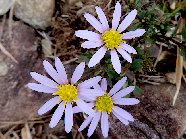| 山行記 | ●ここは先月訪れたばかりなのだが、そのときはムラサキセンブリが咲き始めで、ウメバチソウの蕾も気になっていたので、この日再度訪れることにした。 ●この日の天気予報は曇りとあまり良くは無いが、とにかく行ってみることにした。いつものように平日なので比丘尼駐車場にはまだ1台の車も停まっていなかった。 ●支度が整うと早速歩き始める。まずは登山口近くに咲く小さな小さなアイナエの花に挨拶をしてからおすすめの小径を歩いていく。道沿いではコウヤボウキが咲き、エンシュウハグマもなんとか残っていた。 ●さらに進むと、お目当てのムラサキセンブリの花がいたるところで咲いていた。外にも、リュウノウギクやヤマラッキョウ、リンドウなども各所で咲いているのが観られた。 ●東屋から比丘尼城址、愛の鐘と、おすすめの小径を歩いていくと、いろいろなサクラが咲く世界の桜の園ということで、桜の種類によってはすでに葉を落としたものが多かったが、葉を残すものの紅葉はとても綺麗だった。 ●おすすめの小径を外れて金山方面へ進むと、草刈りはされているもののややヤブっぽくなってくる。それでも、それは樹林帯に入るまでで、以降は薄暗いが歩きやすい道になる。 ●林道を横切ると金山山頂へのジグザグの急登が始まり、それを登り切ると大きく刈り払われた金山山頂に着く。刈り払われたばかりのときは本宮山や吉祥山などの好展望が広がっていたが、すでに木々が伸び始めてやや邪魔な感じになっていた。 ●金山山頂から県境稜線を緩やかに下っていくと裸地に出る。裸地では前回まだまだだったムラサキセンブリが、株は小さいもののいたる所でよく咲いており、ミカワマツムシソウやウメバチソウなども観ることができた。 ●さらに進み、新城方面への下降点を過ぎ、展望ピークを越え一旦下って登り返せば雨生山山頂だ。この辺りでは平日にもかかわらず多くの登山者と出会った。 ●雨生山山頂で少し過ごした後、一旦展望ピークまで戻り、雨生山反射板経由で新城側の林道へ下るが、道沿いでは、ムラサキセンブリやヤナギノギク、リンドウ、センブリなどが咲いていた。 ●林道まで下ると後はその林道をしばらく歩くのだが、道々スズカアザミやリンドウ、ヤマハッカなどが咲き、ドウダンツツジやハゼノキなどの紅葉がすでに見ごろを迎えていて綺麗だった。 ●林道から送電線鉄塔巡視路へ入り、草刈りがされて快適になった道を歩いておすすめの小径と合流し、そのおすすめの小径を歩いて西登山口まで下る。後は農道を歩いて比丘尼駐車場まで戻ったが、比丘尼駐車場には多くの車が停まっていた。 |