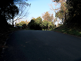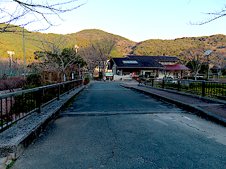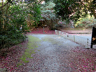 | 滝頭公園駐車場と衣笠山 | カンツバキの花びらがピンクの絨毯のよう | 松尾岩登山口のある林道終点 |