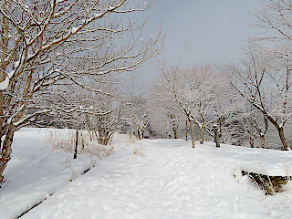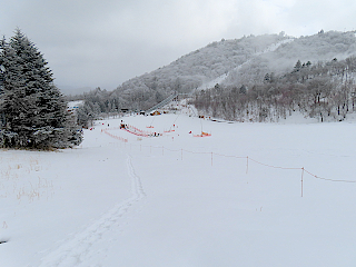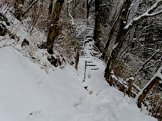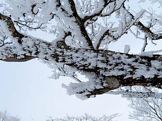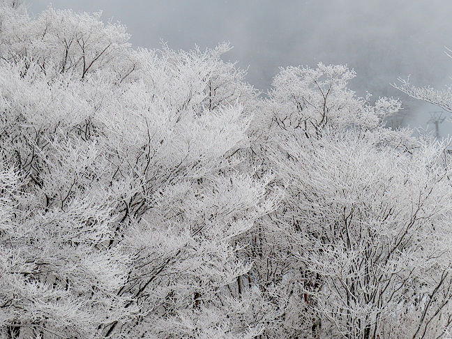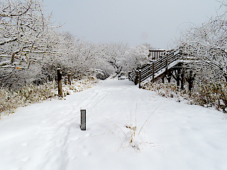 | 山行記 | ●この冬「最強最長」の寒波が襲来した。豊川でも朝の気温は零下で、茶臼山の気温予想もマイナス12度になるという。そこで、足の具合が気になっていてなかなか行けていなかった、この冬初めてのスノーシューハイクに出かけることにした。 ●豊川を早朝に出たのだが、奥三河方面は厚い雪雲に覆われていて、山の天気は微妙な感じだ。道は、田口を過ぎると路面にも雪が現われるようになり、茶臼山高原道路は完全な雪道だったが、なんとか茶臼山第一駐車場まで行くことができた。 ●平日ということもあり駐車場は空いていたが、雪で区画線が見えないので、どこに停めたらいいかわからず戸惑う。それでも、この日は、以降もそれ程混雑しそうもないので、車間を十分確保して停めることにした。 ●現地の天気は曇りだったが、時折僅かだが青空も見えており、これから晴れるのではないかと期待を込めて出発することにした。やはり気温は低いので期待した霧氷は観ることができたのだが、青空ではないので映えないのは仕方が無い。 ●下で準備をしていると、係員に、ゲレンデ内には入らないようにと釘を刺された。茶臼山の後、余力があったら萩太郎山へも行ってみようと思っていたのだが、そう言われた以上、それはできないようだ。 ●まずは茶臼山西登山ルート登山口のある第二駐車場へ上っていく。登るに連れ視界が広がっていくが、曇り空で霧も濃く南アルプスなどの山々の展望は望むべくもない。それでも、霧氷を纏った樹々がいい感じだ。 ●第二駐車場に着くと霧氷の樹々を間近に観ることができるが、写真を撮ろうとしてもピントが合っているのかどうかがカメラのディスプレイで確認できず、結局、思ったとおりそこで撮った写真はすべてピンボケになっていた。 ●駐車場を横切って風力発電用の風車のある茶臼山西登山ルート登山口から山道を登り始める。登山道の雪は、融けかけて凍ったこれまで降った雪の上に新雪が薄く降った感じで、ふかふかという感じではなかった。 ●樹々には霧氷や積もった雪がいい感じなのだが、曇り空なので映えないのが残念だ。それでも、時折青空がのぞき、日が当たったりする瞬間はいい感じだった。 ●自由の広場まで来ると雪も多くなり、樹々の霧氷もより厚くなって見事だ。樹林帯に入ると急な登りが始まる。無雪期に、傷んだ木の階段などが改修されたということだが、この時期は雪に埋もれてよくわからない。 ●森の広場方面への分岐を過ぎると、稜線までは急な階段が続く。それをスノーシューで登るのは大変だが、真新しい階段に改修されたのはよくわかる。 ●階段を上り切ると稜線に着くが、濃い霧に包まれて隣の萩太郎山すら観ることができないのは残念だ。稜線から霧氷の樹々を楽しみながらほぼ平坦な道を進んでいくと茶臼山山頂に着く。 ●そこで左のスノーシューのかかとの締め具の付け根が破断しているのに気付いた。この日は色々なコースを巡ろうと思っていたのだが、これでは何ともならないので、展望台でしばらく過ごした後、来た道を戻ることにした。 ●とりあえず、足先側の締め具を強めに締めた状態で下ることにしたのだが、急な階段はとても下ることができないので、片足だけでなんとか下ることができた。 ●下山時には霧の中から萩太郎山などが見えるようになったいたが、いつの間にか雪が降り出し、遠くはますます見えなくなってきた。駐車場まで戻ると、スキーを滑っていた妻と合流し、レストランで昼食を採ることにした。 |