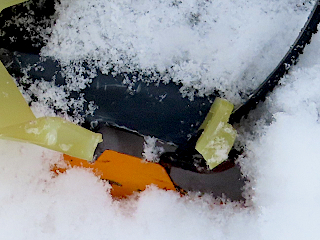 | 破断してしまったスノーシューのかかと部分 | 破断してしまったスノーシューのかかと部分 | 車のフェンダーにも雪が付いていた |