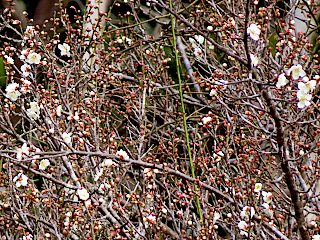 | 鳥居越しの五ヶ所湾と南伊勢町の街 | もうウメの花が咲く | 登山道ではマンリョウが目立つ | |