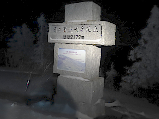 | 横手山山頂ヒュッテで暖かいスープを飲む | 雪上車のスノーモンスターも凍り付く | 国道最高地点の標石 | |
