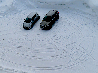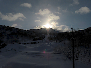 | ホテルから観る横手山山頂からの日の出 | 轍が面白い | ホテル付近から観る笠ヶ岳 | |