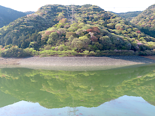 | いつの間にか春本番となった水不足の五葉湖とパステルカラーに染まる周辺の山々 | ||