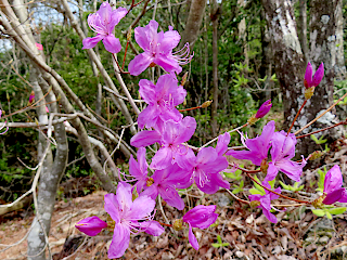 | 山行記 | ●近所の里山でも春の花の季節が始まったようなので、今年になって初めて五葉湖を訪れることにした。この日の天気は、午前中晴れということなので、いつもよりは若干早めに豊川を出て、五葉湖駐車場に着いた。 ●五葉湖駐車場には珍しく一台の車の停まっていなかった。五葉湖駐車場のトイレはコロナ禍以来の使用禁止となっていたので、張り紙を見ると、このところの水不足のためということだった。 ●それでも、そこを使用しなければ、どこか別のトイレを使用しなければならないわけなのだが、水資源公団の運営なので、ここのところの水不足を考えると、そうせざるを得ない立場も理解することができた。 ●とにかく、支度を済ませると早速堰堤を歩いて野鳥の森入口へ向かう。やはり五葉湖の水位は、このところの雨にもかかわらず依然低いままだが、周囲の山肌は、新緑やヤマザクラなどで淡いパステルカラーに染まっていていい感じだ。 ●湖畔道路では、まだまだサクラが見頃で、その蜜を吸いに来たメジロが忙しく花を渡り歩いていた。道沿いではクサイチゴやアケビ、サルトリイバラの花などが目立っていた。 ●野鳥の森入口からレンゲツツジの小径を抜けて作業道に出ると、それを少し歩く。途中の送電線のために刈り払われた場所からは、吉祥山とその肩に頭を出す本宮山、そして豊橋スマートインターチェンジの新城側の工事現場を見ることができた。 ●作業道は送電線鉄塔のある広場で終点となり、以降は山道を歩くようになる。道沿いではモチツツジが咲き始め、マルバアオダモやナツトウダイなどの花を観ることができた。 ●赤い実の小径を分けると五葉山へ向かう急な登りが始まるが、このところの雨で道が濡れているので、滑らないよう慎重に登った。それを登り切ると五葉山山頂で、そこからは豊橋スマートインターチェンジの豊橋側の工事現場を観ることができた。 ●五葉山からは市境稜線をアップダウンしながら進む。途中、五葉城址への分岐を過ぎると、急な上り坂が現れるが、それを登り切ると高城砦跡に着く。高城砦跡にはキッコウハグマの幼葉が多く観られた。 ●高城砦跡から短いが急な坂を下ると、次は徐々に登り始める。途中二度の急登を登り切ると展望の広がる場所に出るが、そこから少し登ると平坦な道に代わり、すぐに県境となる展望の無い平尾山山頂に着く。 ●以降は県境となる弓張山地主稜線を歩くようになる。いつも山頂直下の急坂は滑りやすくて大変なのだが、この日は、このところの雨のおかげで適度に湿っていて歩きやすかった。 ●岩場を過ぎると伐採地に出るが、この日は遠くが霞んでいて、いつもは観える富士山や南アルプスなどは観ることができなかった。それでも、アセビやアオキ、シキミなどの木の花や足元にはスミレの仲間などがよく咲いていた。 ●送電線鉄塔まで下ると、そこで県境稜線から離れて送電線鉄塔巡視路の急坂を作業道まで下り、以降はその作業道を歩く。作業道でもフイリフモトスミレやタチツボスミレなどのスミレの仲間やイズセンリョウの花などを観ることができた。 ●やがて作業道は林道と出会うので、そこからは林道を歩く。林道では、ヤマザクラやキブシ、ショウジョウバカマなどの花を観ることができた。平尾山、五葉山への分岐を過ぎるとすぐに案内があるので、それに従って緩やかに登れば五葉城址に着く。 ●春休みなので五葉城址にはスポーツ少年がいて賑やかだった。眺めの方は、やはり全体的に霞んでいて遠くの山を観ることはできず、花もほとんど観ることができなかった。 ●五葉城址からはいつものように林道をひたすら下る。林道沿いではヤマウグイスカグラやクロモジ、ヤブツバキなどの花が咲いていたが、何よりも、新緑やさくらの淡い色に染まる山肌がいい感じだった。 ●林道は途中から舗装道に代わり、車止めを抜けるが、期待していたキクザキイチゲはすでに終わっていた。舗装道はその先で湖畔道路と合流するので、それを歩いて、朝、車を置いた五葉湖駐車場まで歩いた。 ●五葉湖駐車場には前回見かけたのと同じネコを見た。ネコは人を恐がる様子も無く、堂々と駐車場の真ん中に居座っており、車が動くと面倒くさそうに退くという感じで。どうやらこの猫はこの辺りで生活しているようだった。 ●ついでだが、車に乗って五葉湖駐車場から出ようとした時、舗装道の側溝に、今度はイタチを見掛けた。イタチはすぐに奥に隠れてしまったので、残念ながら写真に収めることはできなかった。 |