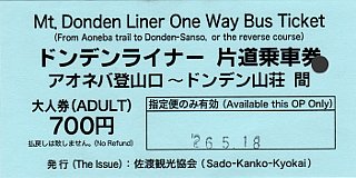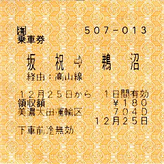 ドンデンライナー乗車券(ドンデン山荘→アオネバ登山口)狭い急勾配を猛スピードで下る絶叫マシンのようなバスでした。尻立山(2014/5/18) | JR高山本線(坂祝駅→鵜沼駅) 車内で発行された切符です。 八木山、金比羅山(2013/12/25) |