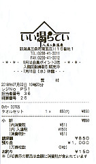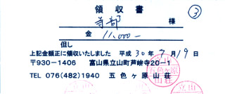 五色ヶ原山荘の領収書 お風呂に入れます。昼の弁当代込です。 薬師岳(2018/7/19) |