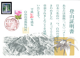 白山登山証明書 室堂の郵便局発行のものです。 白山(2015/7/31) |