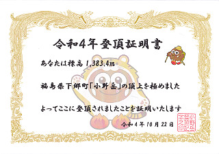 小野岳登頂証明書 山頂にあるQRコードで応募すると貰えます。 小野岳(2022/10/22) |