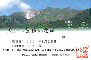 天上山登頂記念証(表) 港の神津島観光協会に頼んでおくと翌日交付されます。 天上山(2024/7/25) |