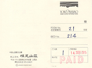 横尾山荘の部屋札兼領収書 大キレット(2015/9/14) |
