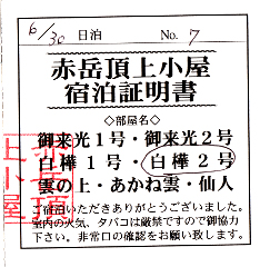 赤岳頂上小屋の宿泊証明書 赤岳(2007/6/30) |