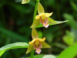 宇利城址近く(新城市中宇利) 宇利城址近くの田圃の奥の斜面に様々な野草が咲く。 ハルリンドウに始まって、カキラン(左の写真)やヤマトキソウ、ササユリ、キキョウなどが次々に咲き、飽きさせません。 また、田圃にはイモリが発生したり、自然が豊富なところです。 |