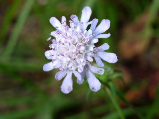 比丘尼城址(新城市中宇利) 比丘尼城址一帯は、「世界の桜」を売り物によく手入れがされているところで、1周約一時間の「おすすめの小路」が整備されている。他にもいろいろな遊歩道が整備されており、金山や雨生山へも行くことができます。 ここは桜以外にも野草が豊富で、ムラサキセンブリやキンラン、シランなどが咲き競います。 特に、蛇紋岩地帯にはミカワマツムシソウ(左の写真)など、特有の珍しい花が咲いています。 |