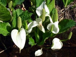 落倉自然園(長野県小谷村) 長野県の岩岳スキー場から栂池スキー場に向かう途中にある湿原で、ミズバショウ(左の写真)やザゼンソウが有名なところです。 駐車場やトイレもあり、湿原には木道が整備されています。まだ数回通っただけですが、その外の野草も豊富で、季節を変えてまた訪れてみたいところの一つです。 |