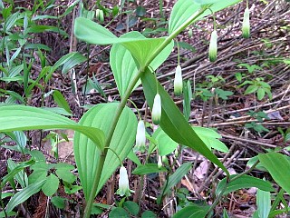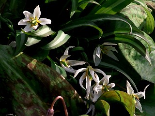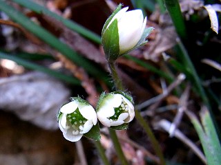 平成22年2月28日 カタクリ山では、ヒロハノアマナが満開です。 カタクリ山で、カタクリに先駆けて咲くヒロハノアマナが満開で、純白の可愛い花が斜面のあちらこちらで群生しているのを見ることができます。 一方カタクリの方は、葉が目立つようになってきており、蕾もちらほら見え始めましたので、咲き始めるのもあと少しでしょう。 |