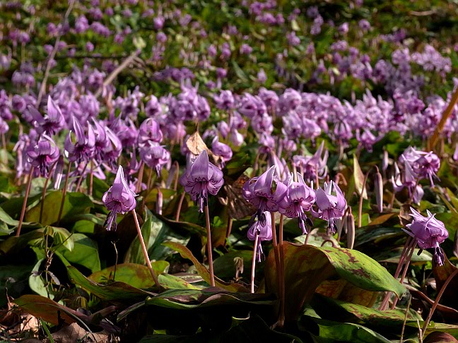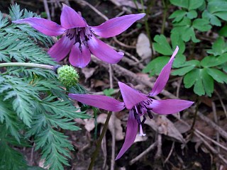 平成22年3月10日 カタクリ山では、カタクリが一斉に咲き始めました。 大雨の後、ようやく晴れ始めたこの日、カタクリ山では、カタクリが一斉に咲き始めました。開く直前の蕾も多く、あと1週間ぐらいで満開になると思われます カタクリの外にも、ヒロハノアマナもまだ見られ、イチリンソウやジロボウエンゴサク、ヒメウズなども咲き始めています。 |