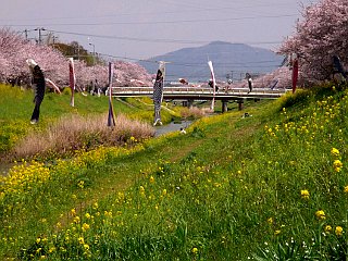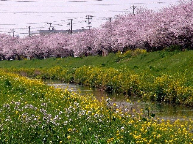 | 平成22年4月5日 豊川市の佐奈川沿いでは桜が満開です。 川沿いに多くの桜が植えられている佐奈川は桜の名所です。丁度桜の咲く時季にセイヨウアブラナ、セイヨウカラシナなどの黄色い菜の花も咲き、最近増え始めた白いハマダイコンが混じって、見事な三重奏を見ることができます |