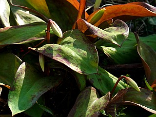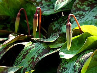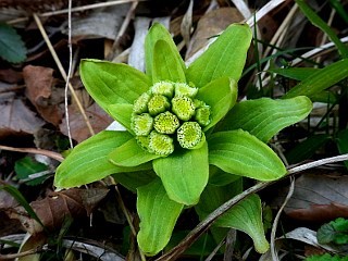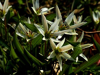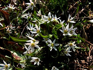 平成23年3月13日 ヒロハノアマナが最盛期のカタクリ山 カタクリ山はヒロハノアマナが最盛期を迎えていました。一方カタクリも、葉が目立ち始め、蕾も大きくなってきており、そろそろ咲き始める株もありそうです。 |