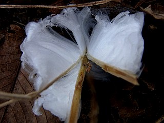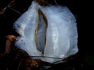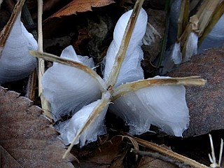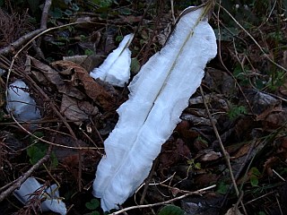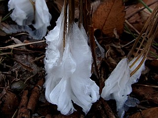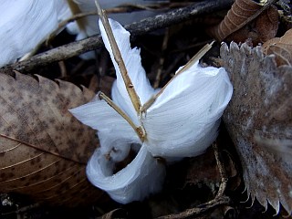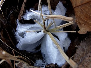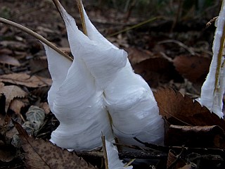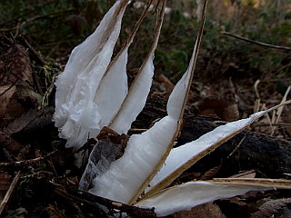 | 平成23年1月21日 綺麗なシモバシラの霜柱を見ることができた大原調整池 吉祥山の帰りに、こちらも気になる大原調整池へ寄ってみました。ここでは、完全に茎の組織が破壊され四方に裂けた綺麗なシモバシラの霜柱を見ることができました。 |