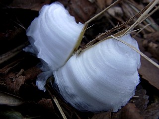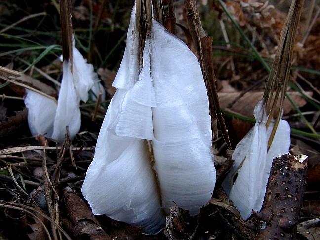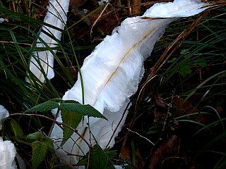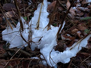 平成23年12月27日 シモバシラの霜柱が見られる大原調整池 吉祥山の帰りに寄った大原調整池でもシモバシラの霜柱が至る所に出現していました。 |