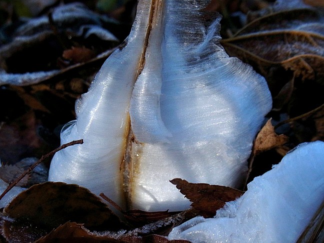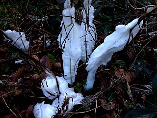 平成23年1月29日 またまた訪れてしまった大原調整池 今年は厳冬で、よくシモバシラの霜柱を観察することができました。この日も絶好の霜柱日和で、妻に聞いたら行ってみたいということなので、またまた訪れることになりました。 後日ですが、テレビの「ナニコレ珍百景スペシャル」で高尾山のシモバシラの霜柱が自然の珍百景として紹介されていました。 |