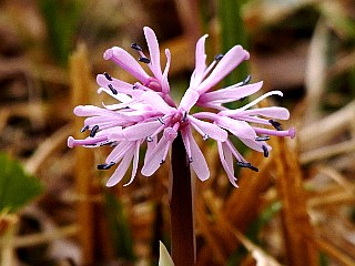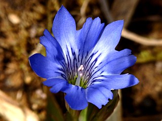 | 平成25年3月2日 一輪だけハルリンドウを見つけた春まだ遠い宇利城址近く 宇利城址近くでは、ハルリンドウを一輪見つけることができたのと、ショウジョウバカマやフキノトウなどを見ることができましたが、厳冬の影響なのか春の花の開花は全体的に遅れているようです。 |
