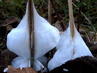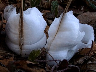 | 平成25年1月5日 大原調整池のシモバシラの霜柱 12月の冬の冷え込みが強かったせいか、大原調整池のシモバシラの霜柱も既に終わりに近づいているようで、年末に比べ少し寂しい感じでしたが、気温が低かったため、小さくても美しい霜柱の霜柱を見ることができました。 |