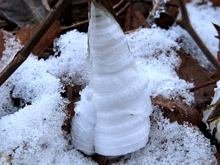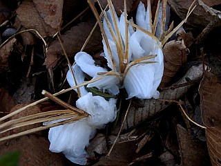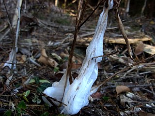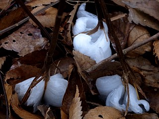 平成26年1月27日 今シーズンも終わりに近づいた大原調整池のシモバシラの霜柱 またまた吉祥山へ行ったついでに大原調整池に寄りました。シモバシラの霜柱もそろそろ出つくしたようで、大きいものは見られませんでした。平日ということもあり、見に来る人も外にはいませんでしたが、根本の組織が壊れていく様子をよく観察することができました。 |