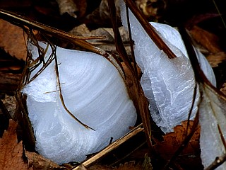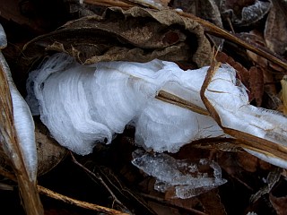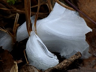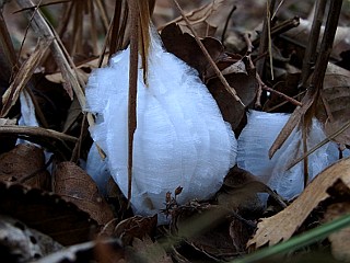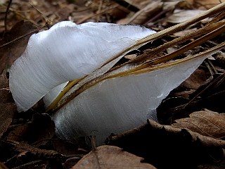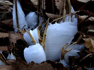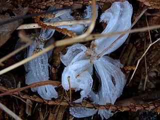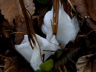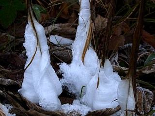 | 平成26年1月14日 大原調整池のシモバシラの霜柱 吉祥山へ行ったついでに、大原調整池にも寄ってきました。いつもの場所は、保護の柵が張られていましたが、中に入ることができ、シモバシラの写真を撮ることができました。これで、植生保護に対する意識が高まり、踏み荒らしや盗掘などが無くなるといいと思います。 |