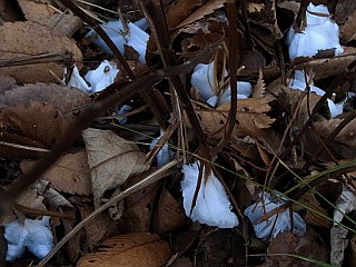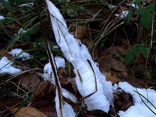 平成26年12月19日 雪中のシモバシラの霜柱が見られる大原調整池 吉祥山では、よく見ることができなかったシモバシラの霜柱も、大原調整池では雪の中しっかりと見ることができました。 |
