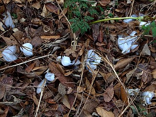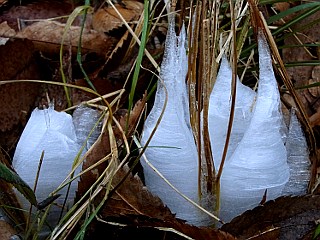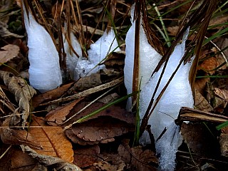 | 平成26年12月28日 融けかけのシモバシラの霜柱が見られる大原調整池 吉祥山のシモバシラの霜柱はどうやら終わりのようなので、大原調整池へ寄ってみました。前回よりも多くのシモバシラの霜柱を見ることができましたが、融けかけのようで、本来の美しさを楽しむことができませんでした。 |