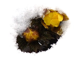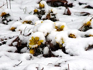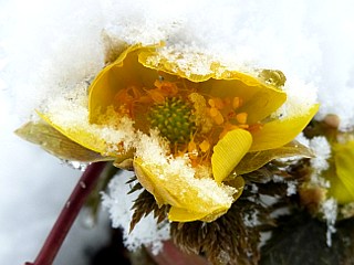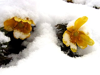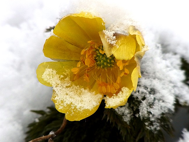 | 平成26年3月20日 大雪の中けなげに咲く大町市新行のフクジュソウ 爆弾低気圧で、この季節には珍しい大雪の中、咲き始めていたフクジュソウは、雪に覆われながらも負けずに咲いていました。 |