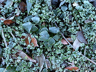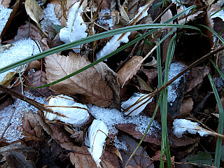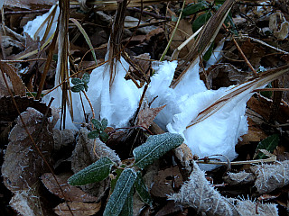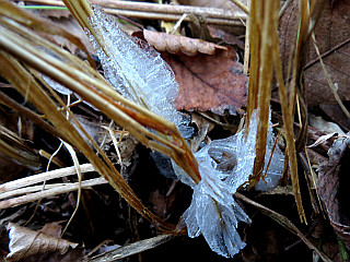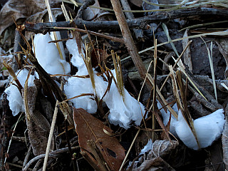 | 平成29年1月6日 少ないがシモバシラの霜柱が見られる大原調整池 またまたシモバシラの霜柱が空振りに終わった吉祥山の帰りに寄った大原調整池では、前回よりも少なく、融けかけですが、シモバシラの霜柱を見ることができました。 |