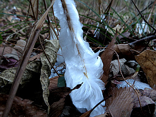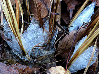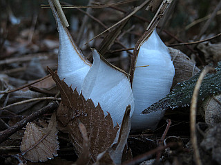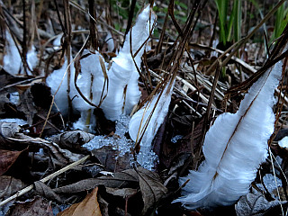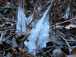 | 平成29年2月12日 まだまだシモバシラの霜柱が見られる大原調整池 またまた、吉祥山の帰りに大原調整池へ寄りました。一時期と比べると大きなものは見られなくなったものの、各所で、出来立てで美しいシモバシラの霜柱を見ることができました。 |