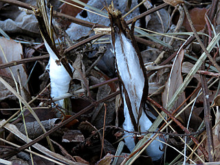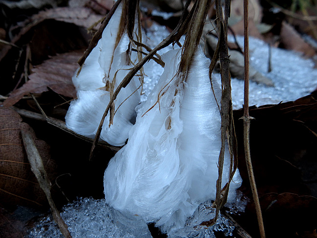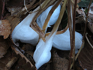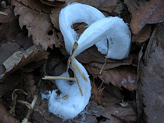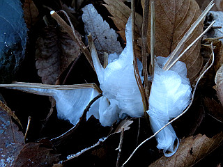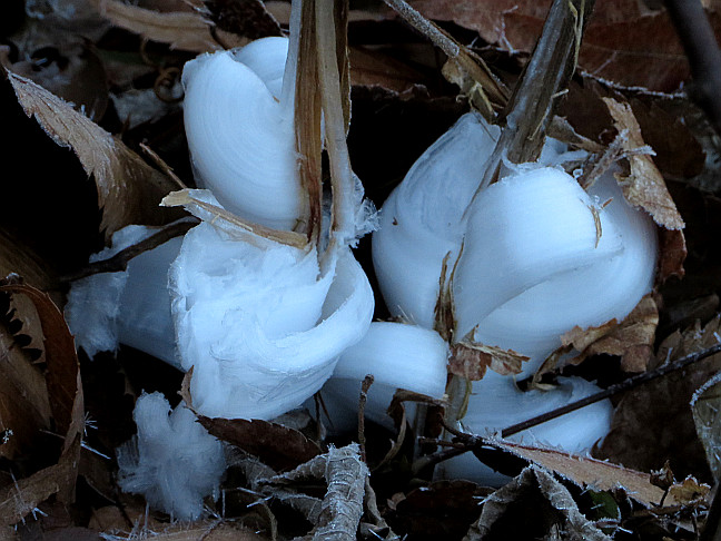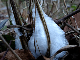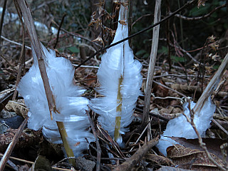 | 平成29年12月23日 この冬初めてのシモバシラの霜柱 シモバシラの霜柱を確認できなかった吉祥山の帰りに、駄目元で寄った大原調整池ですが、一部の株で、融けかけではありますが、シモバシラの霜柱をみることができました。外には、シモバシラの霜柱で既に組織が破壊されたものがある一方、これから見られるものまであり、シモバシラの霜柱が出現するタイミングはとても難しいものです。 |