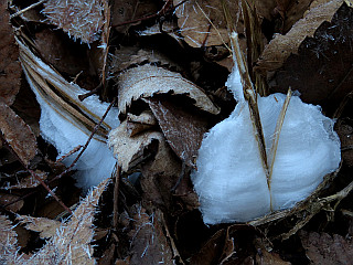 | 平成29年12月29日 本格的にシモバシラの霜柱が見られるようになった大原調整池 この日も吉祥山ではシモバシラの霜柱を確認することができませんでしたが、大原調整池ではいたるところで美しいシモバシラの霜柱を見ることができました。 |